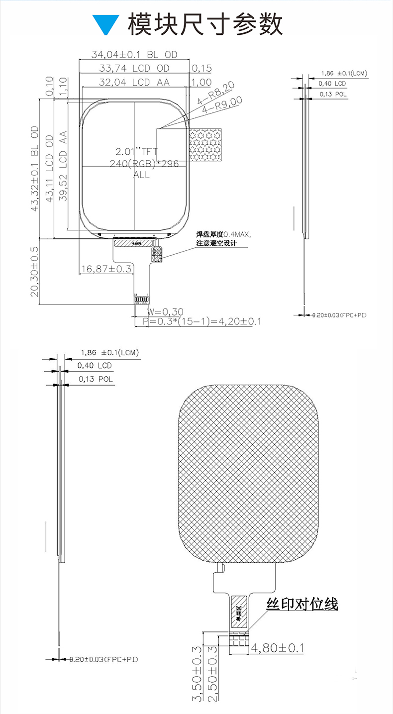 2.0寸tft液晶顯示屏 240x296lcd小尺寸TFT201BJ1040-15A