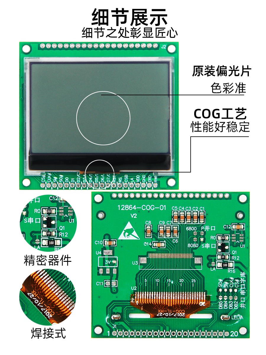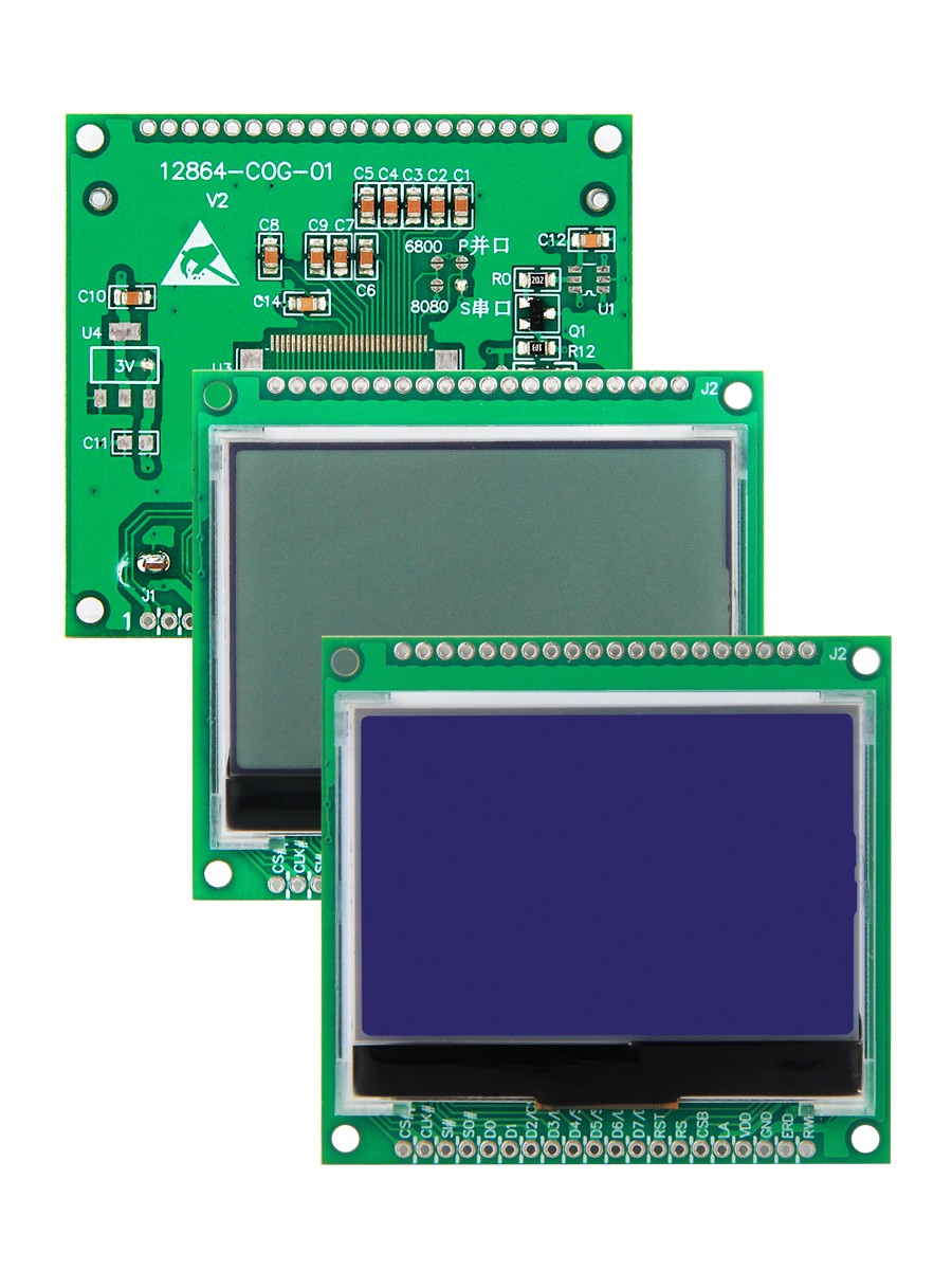 C0G:將驅(qū)動(dòng)芯片(例如 ST765)、FPC 軟板(例如金手指)直接壓貼在玻璃上的封裝形式叫做 COG,有性價(jià)比高,低功耗,體積小,軟件指令豐富的優(yōu)勢(shì)工作電壓3.3V,背光電壓3.3V60MA,可做5V,采購(gòu)時(shí)請(qǐng)和業(yè)務(wù)說明電壓通訊方式:8位并行(6800和8080時(shí)序),4線串行通訊,采購(gòu)時(shí)請(qǐng)和業(yè)務(wù)說明迅方式