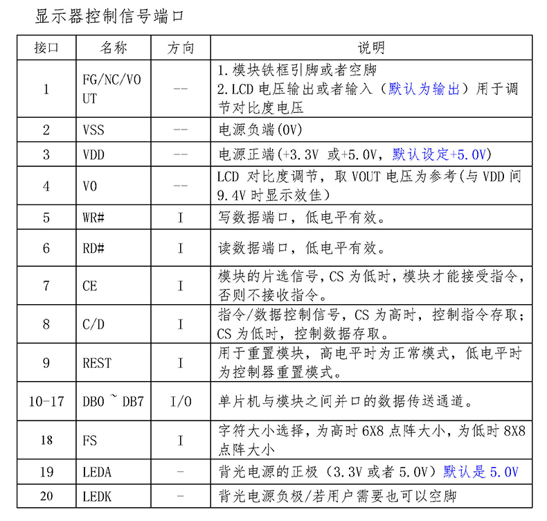 提供供與MPU通訊方式:8位并行8080時序硬件初始化,完成大部份初始化工作,用戶更多時間花在軟件編寫上128字型ROW(OGROM),ASCII日文,英文,數(shù)據(jù),(默認芙文)